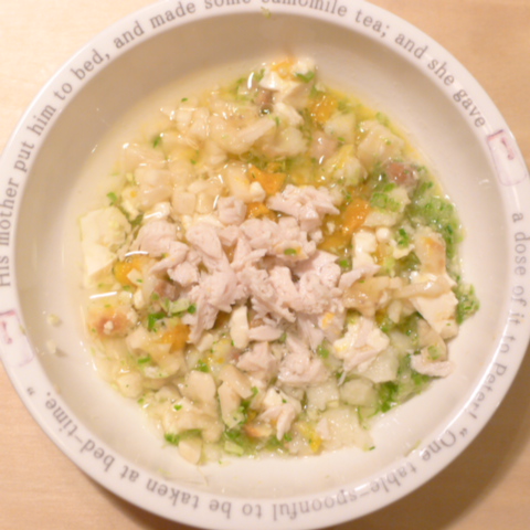 ささみ8g 豆腐11g 納豆3.5g じゃが芋10g きゃべつ6g ブロッコリ芽2g 三度豆7g 南瓜10g 亜麻仁油0.5g バナナ10g ebi1T bio3g VC0.2g