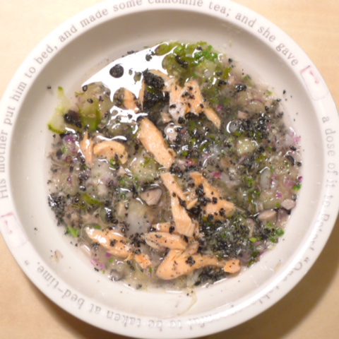 鮭8g 納豆3.5g 黒豆5g さつま芋10g きゃべつ6g ブロッコリスプラウト6g もやし7g 昆布1g 黒ごま3g ダノン20g バナナ10g ebi1T bio3g VC0.2g