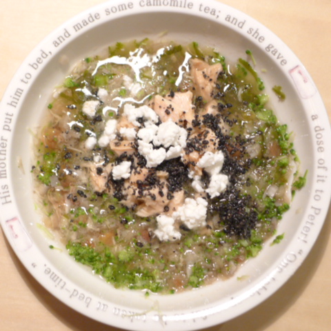 鮭8g さつま芋8g きゃべつ8g ブロッコリ8.5g 茄子8g プチトマト8g 舞茸5g+出汁6g 昆布0.5g 黒ごま3g カッテージ3g 小岩井20g ebi1T bio2g Vc0.5g Ca0.3g Zn0.1 のこぎりやし1T