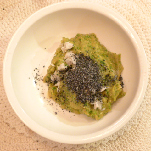 さわら(福岡)8g 芋15g 南瓜12g トマト35g きゃべつ5g ブロッコリ6g 小松菜5g おくら5g 舞茸5g 亜麻仁油0.7g 黒ごま1g 雪誉納豆2.8g ブルーベリー5g 六条麦茶80g ebi1T bio1g EsterC0.5g
