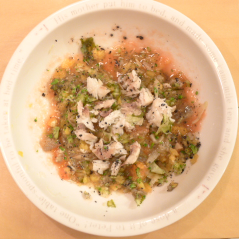 【朝ご飯】ぶり(熊本養殖)6.5g 安納芋13g キャベツ3.5g ブロッコリ3.5g トマト30g 舞茸5g 黒ごま1g ブルーベリー6g 小岩井10g ebi1T bio2/3g 湯60cc