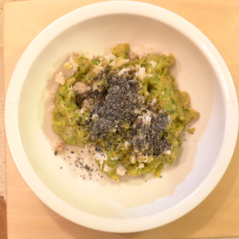 あじ(長崎)8.5g 芋18g 南瓜8g トマト33g きゃべつ7g ブロッコリ5g 小松菜5g おくら5g 亜麻仁油0.5g 黒ごま1.7g ebi1T bio1.2g EsterC0.4g ブルーベリー7g 黒豆納豆3.5g 六条麦茶80g