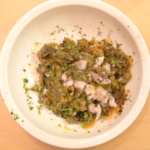【夕ご飯】 あじ(長崎)7.5g 納豆3.5g 安納芋11g キャベツ5g ブロッコリ5g マッシュルーム5g 柿25g 黒ごま1.5g ブルーベリー1g 小岩井10g 亜麻仁油0.5g ebi1T bio2/3g Ca0.2g Zn1/8T 湯60cc