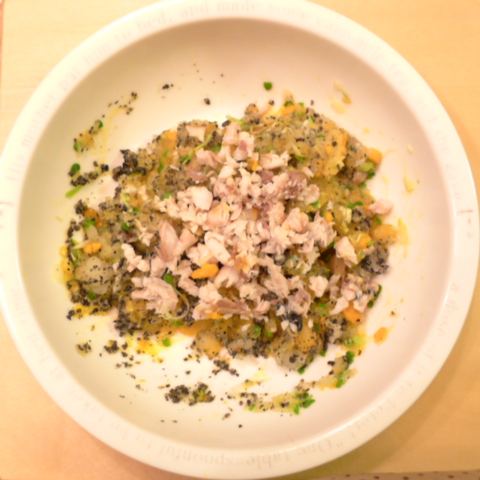さんま(日立鹿島▲)7g 納豆3.5g 安納芋11g キャベツ5g ブロッコリ芽5g 南瓜7g りんご28g 黒ごま1.5g ブルーベリー1g 小岩井10g 湯80cc ebi1T bio2/3g VC0.1g Ca0.1g n1/8g