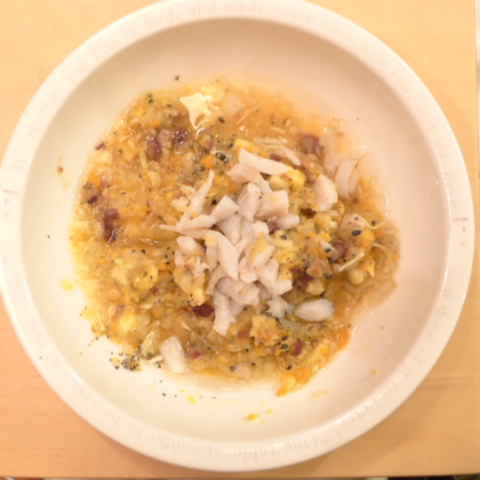 真鱈(北海道)7g 納豆2.8g 小豆5g 坂出金時10g キャベツ5g もやし5g 南瓜6g りんご28g 黒ごま1g ブルーベリー1g 小岩井10g 亜麻仁油0.5 ebi1T bio2/3g Ca0.1g 湯80cc