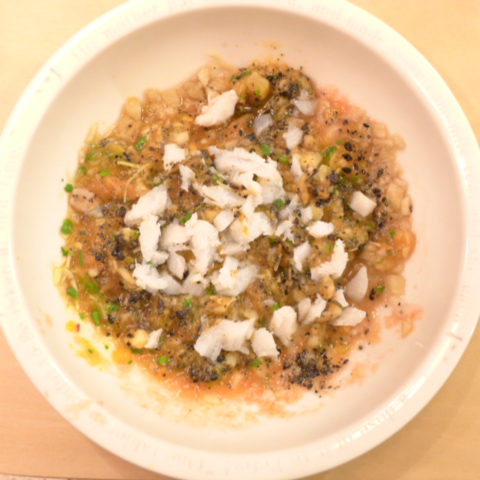 【夕ご飯】鱈(北海道)7.5g 豆腐(けんちゃん)7.5g 坂出金時10g キャベツ5g ブロッコリ芽5.5g 南瓜6g トマト25g 黒ごま1.5g 小岩井10g 湯90cc ebi1T bio2/3g Ca0.1g Zn1/8T