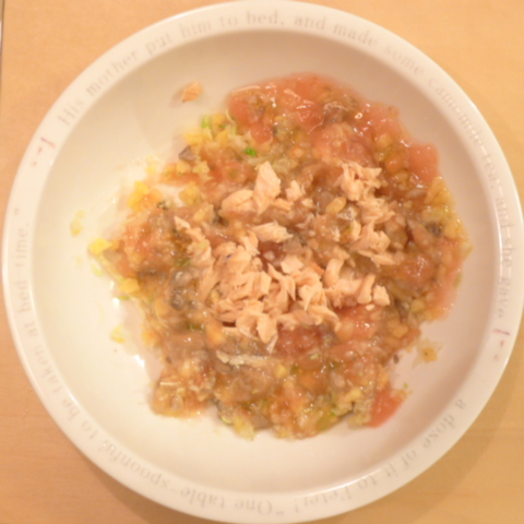 しろさけ(北海道)7g 納豆2.8g 安納芋10g キャベツ生8g ブロッコリゆでg マッシュルームゆで16g