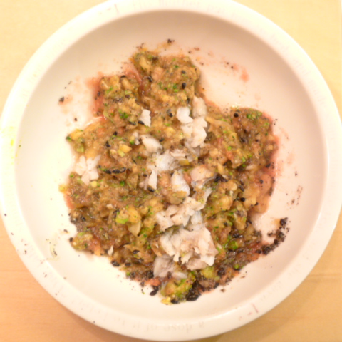 鱈(北海道)7g 鶴の子納豆3g 安納芋11g キャベツ5g ブロッコリ6g 南瓜(熊本)6g トマト30g 黒ごま1.5g ebi1T bio2/3g VC0.1g EsterC0.1g Ca0.1g 湯40cc