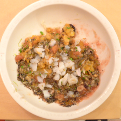甘鱈(北海道)7g 黒豆納豆3g 鳴門金時11g キャベツ5g ブロッコリ芽4g 南瓜6g トマト25g 黒ごま2g 亜麻仁油0.5g ebi1T bio2/3g EsterC0.2g Ca0.1g ダノン10g 湯80cc
