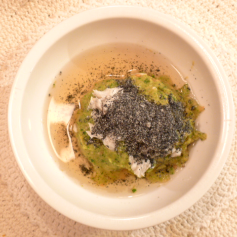 さごち(山口)8.8g 芋15g 南瓜14g 舞茸5g トマト35g きゃべつ6.5g ブロッコリ8g 小松菜5g おくら5g 黒ごま2g 亜麻仁油0.3g ebi1T bio1.5g EsterC0.5g cilantro1g ブルーベリー8.5g 黒豆納豆3.5g 六条麦茶60g