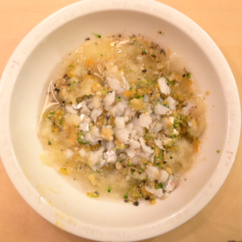 太刀魚(福岡)7g 豆腐10g 安納芋11g キャベツ5g ブロッコリ5g 南瓜(熊本)8g トマト10g 黒ごま1.5g 小岩井10g 湯80cc ebi1T bio2/3g VC0.1g Ca0.1g