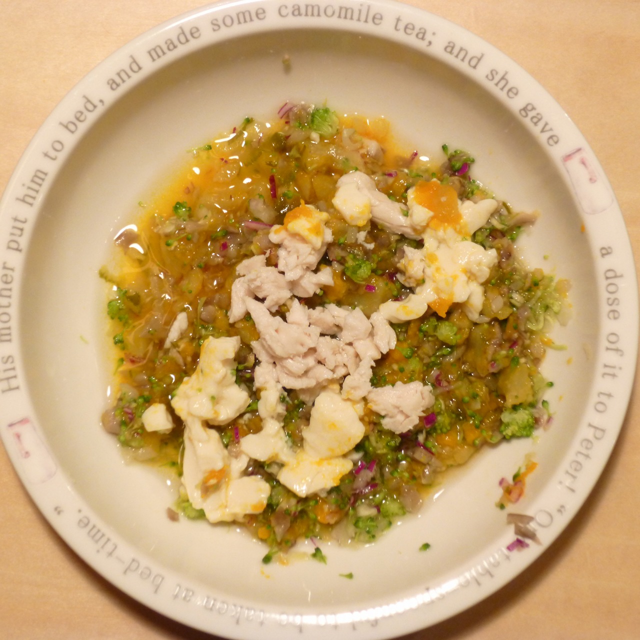 ささみ5g 豆腐10g さつま芋10g きゃべつ5g ブロッコリ5g もやし5g 南瓜10g 舞茸5g 昆布0.1g 亜麻仁油0.2g ebi1T bio1g VCE0.3g
