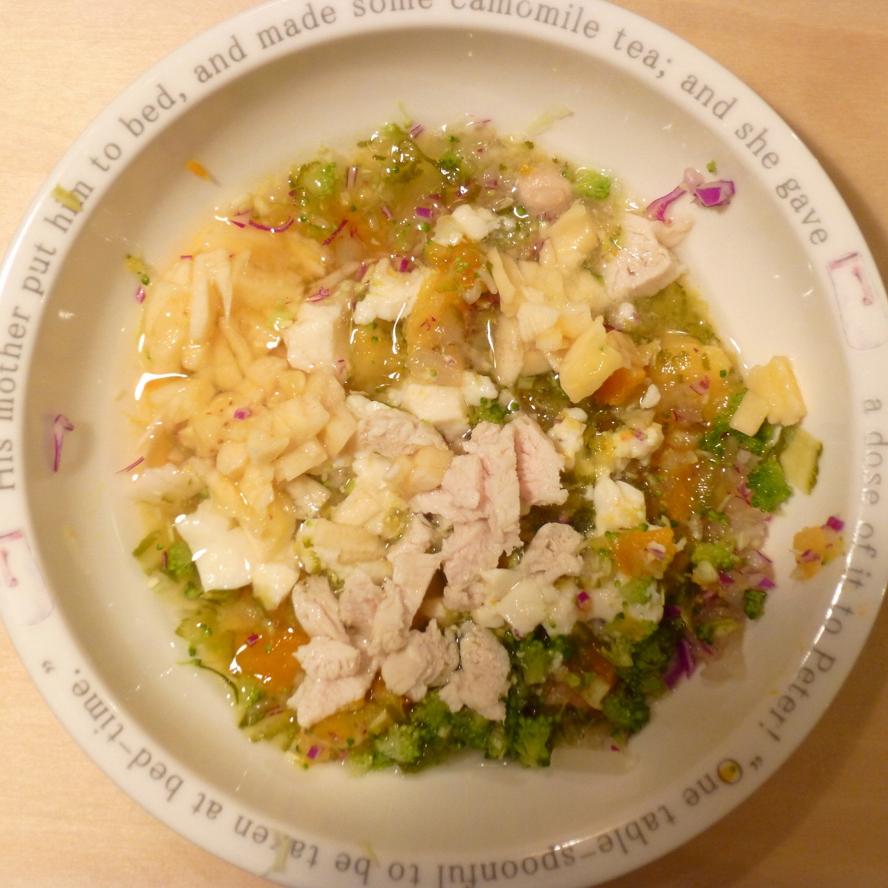 ささみ6g 豆腐10g 安納芋7g じゃが芋3g きゃべつ6g ブロッコリ5g もやし8g 南瓜10g 昆布0.2g 亜麻仁油0.5g バナナ9g 小岩井20g ebi1T bio1g VC0.2g Ca0.2g