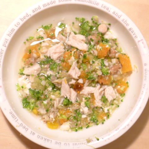 ささみ6g 半熟卵3g 豆腐10g 納豆3.5g さつま芋10g はと麦8g きゃべつ6g ブロッコリ7g 南瓜10g 舞茸6g 亜麻仁油1g 黒ごま1g 小岩井20g ebi1T bio1g VC0.2g Ca0.2g のこぎりやし1ヶ