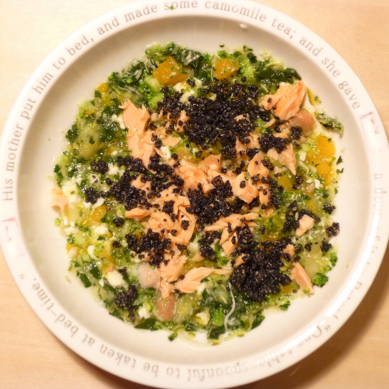 鮭8g 豆腐10g 納豆3.5g さつま芋10g きゃべつ6g ブロッコリ6g 小松菜5g 南瓜10g 昆布1g 黒ごま3g ebi1T bio1g VC0.3g 湯50cc