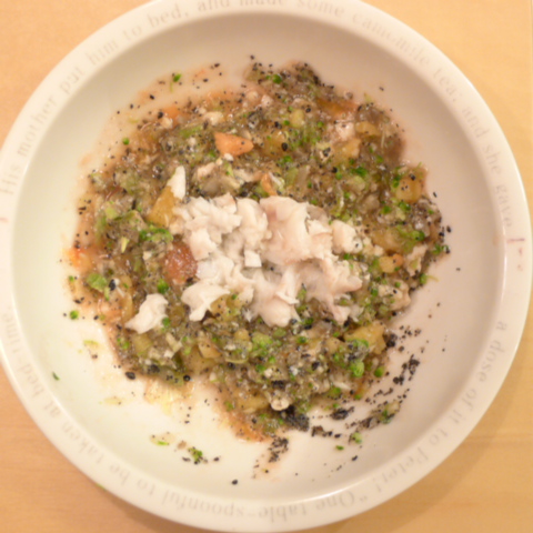 【夕ご飯】黒かれい7g 豆腐8.5g 安納芋10g キャベツ3.5g ブロッコリ3.5g トマト25g 舞茸3.5g 黒ごま2g 昆布0.2g ブルーベリー1g 小岩井10g ebi1T bio2/3g Ca0.2g Zn1/8T 湯60cc