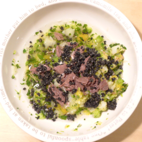 ぶり7.5g 納豆3.5g じゃが芋15g きゃべつ5g ブロッコリ5g 小松菜3.5g 南瓜10g 黒ごま2.5g 小岩井20g 湯70cc ebi1T bio1g VC0.3g Ca0.2g