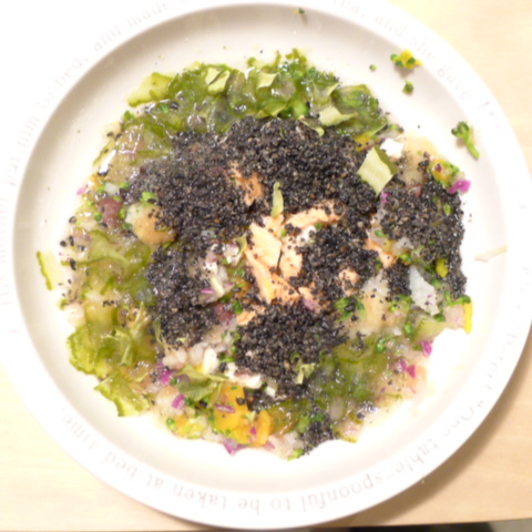 鮭7.5g 豆腐10g 小豆5g りんご10b じゃがいも15b きゃべつ5b ブロッコリ5b もやし6b 南瓜8b 昆布0.1b 黒ごま3b 小岩井20g 湯6cc ebi1T bio2/3g VC0.2g