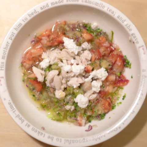 ささみ7.5g 卵黄2g 納豆3.5g 紅はるか15g 苺15g 紫きゃべつ5g ブロッコリ5g マッシュ茸8g 南瓜8g 昆布0.1g 亜麻仁油1g 小岩井20g カッテージ3g 湯20cc ebi1T bio2/3g VC0.2g Ca0.2g Zn1/10T