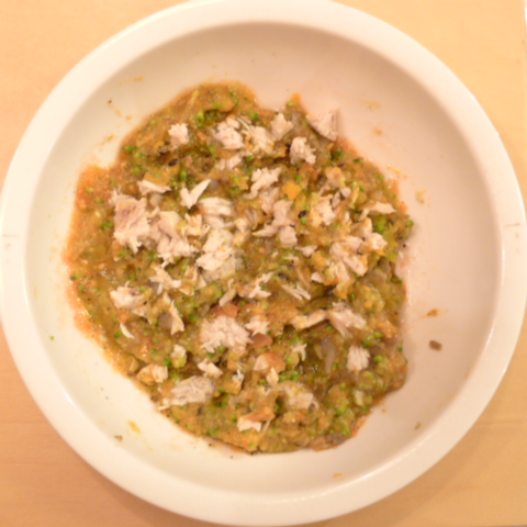 ぶり(長崎)7g 安納芋10g 春きゃべつ7g ブロッコリ8g 南瓜8g トマト25g 黒ごま1.5g ebi1T bio1g EsC0.3g ブルーベリー5g 納豆(雪誉)3g 湯75cc