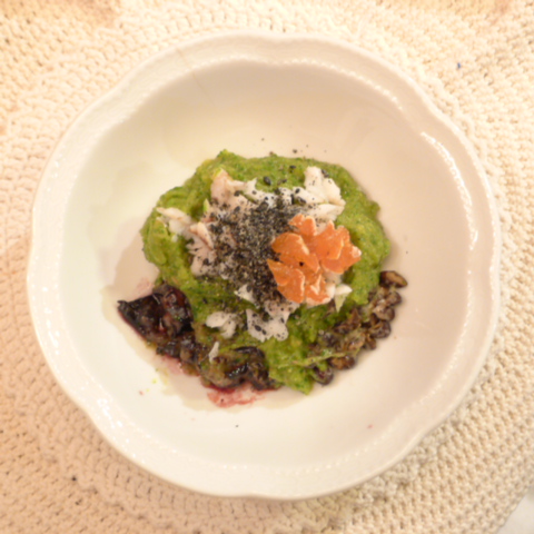 【夕ご飯】赤かれい(北海道)8.3g 芋16g 南瓜(沖縄)12g トマト29g 春きゃべつ6g ブロッコリ5g 小松菜5g ほうれん草5g スナップえんどう5g 黒ごま1g 亜麻仁油0.2g ebi2T bio1.5g Es-C0.5g Cillantro1g ブルーベリー5g 黒豆納豆3g 市田柿3g 俊粉1g 湯50g