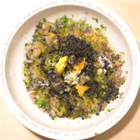 ぶり7g 卵黄3g 納豆2.1g 安納芋15g きゃべつ5g ブロッコリ5g もやし5g 南瓜8g 昆布0.1g 黒ごま2.5g ebi1T bio2/3g VC0.3g