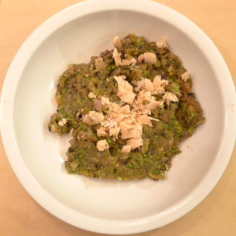 【朝ご飯】鮭(アトランティック)7g 安納芋10g 春きゃべつ5g ブロッコリ5g 舞茸5g+出汁3g 南瓜(鹿児島)9g トマト20g ebi1T bio1g EsC0.3g cilantro1cc 雪誉納豆3g ブルーベリー6g 湯80cc