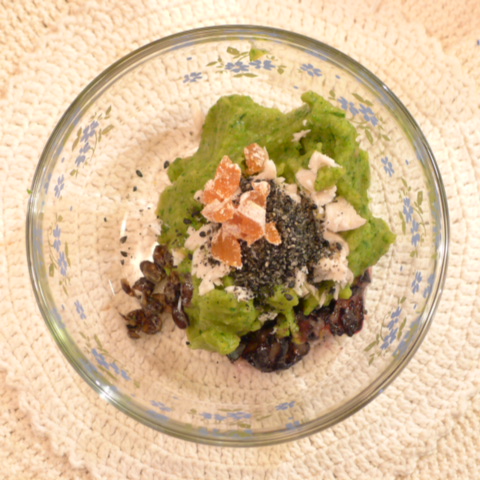 【夕ご飯】ぶり(長崎)8g 坂出金時16g 南瓜12g トマト25g 春きゃべつ5g 小松菜5g ほうれん草5g スナップえんどう5g 黒ごま1g 亜麻仁油0.5g ebi2T bio1.5g Es-C0.5g Cillantro1g ブルーベリー5g 黒豆納豆3.2g 市田柿2.5g 湯50g