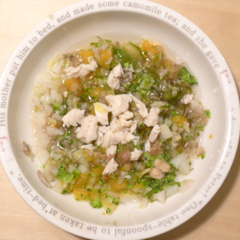 ささみ6g 納豆2.1g じゃが芋15g きゃべつ5g 舞茸10g ブロッコリ5g 南瓜8g 昆布0.1g 亜麻仁油1g カッテージ1.5g 小岩井20g 湯50cc ebi1T bio2/3g VC0.2g Ca0.2g