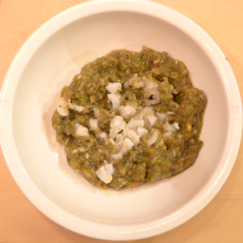 鱈(北海道)7g 雪誉納豆3g 安納芋10g 春きゃべつ6g ブロッコリ5g 舞茸5g 南瓜(長野)9g トマト25g 黒ごま1.5g ebi1T bio1g EsC0.3g cilantro1cc ブルーベリー5g 湯75cc