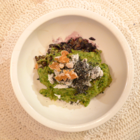 鯛(愛媛養殖)8g 芋17g 南瓜13g トマト28g 春きゃべつ5g 小松菜5g ほうれん草5g 黒ごま1g 亜麻仁油0.3g ebi2T bio1.5g Es-C0.5g ブルーベリー5g 黒豆納豆3g 市田柿2.5g 湯35g