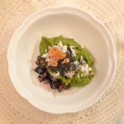 【夕ご飯】鯛(愛媛養殖)8g 坂出金時16g 南瓜12g トマト25g 春きゃべつ5g 小松菜5g ほうれん草5g スナップえんどう5g 黒ごま1g 亜麻仁油0.5g ebi2T bio1.5g Es-C0.4g ブルーベリー5g 黒豆納豆3g 市田柿3g 湯30g