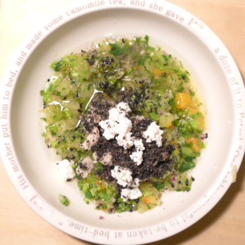 いわし7g 納豆2.8g さつま芋20g 苺6g きゃべつ5g ブロッコリ5g 小松菜5g 南瓜8g 昆布0.05g 黒ごま2g 小岩井20g 湯60cc ebi1T bio2/3g VC0.2g Ca0.2g