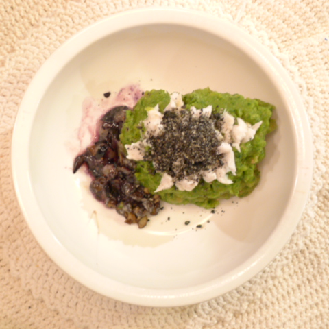 鯛(長崎天然)13g 坂出金時15g 南瓜12g トマト27g 春きゃべつ5g 小松菜5g ほうれん草5g スナップえんどう5g 黒ごま3g 亜麻仁油0.2g ebi2T bio1.5g EsC0.5g ブルーベリー5g 黒豆納豆2.8g 湯85g