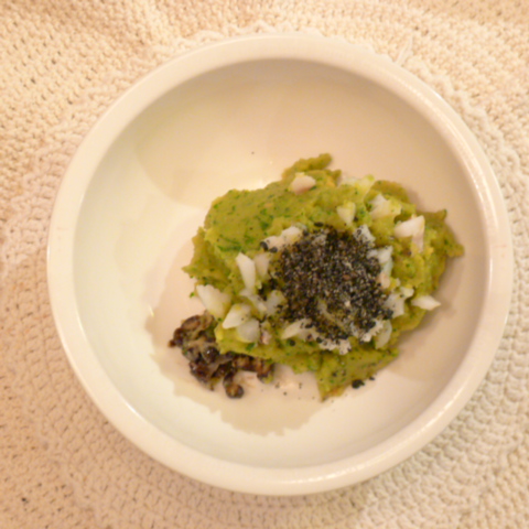 たら(北海道)8g 坂出金時15g 南瓜12g トマト27g 春きゃべつ5g ブロッコリ5.5g 小松菜5g スナップえんどう5g 黒ごま1g 亜麻仁油0.5g ebi2T bio1.5g EsC0.5g 黒豆納豆3.5g 黒粉1g 湯80g