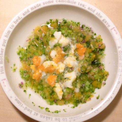 卵10g 納豆3.5g 安納芋15g きゃべつ5g ブロッコリ6g 小松菜5g 南瓜8g 昆布0.1g 小岩井20g 湯60cc ebi1T bio2/3g VC0.2g