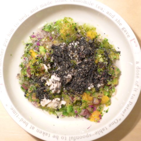 ぶり7g 小豆 3.5g納豆3.5g 安納芋15g 紫きゃべつ5g ブロッコリ6g もやし6g 南瓜5g 昆布0.1g 黒ごま3g 湯60cc