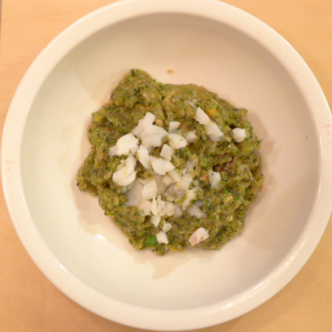 鱈(北海道)7g 黒豆納豆3g 芋12g 春きゃべつ8g ブロッコリ芽5g 香菜1.5g 舞茸5g 南瓜11gトマト33g 黒ごま2g ブルーベリー6g ebi1T bio1g EsC0.3g 湯80cc