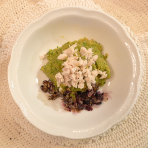 【夕ご飯】ささみ8.5g 芋15g 南瓜11.5g トマト21g 春きゃべつ5g ブロッコリ5g 小松菜5g スナップえんどう5g 亜麻仁油0.4g ブルーベリー5.5g 黒豆納豆3g ebi2T bio1.5g EsC0.5g Cilantro1g 湯