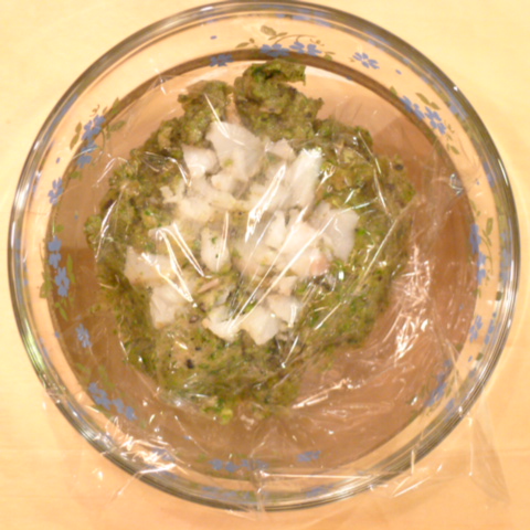 鱈(北海道)8g 雪誉納豆3g 芋11g 春きゃべつ7g ブロッコリ6g 小松菜5g 南瓜11gトマト30g 黒ごま2.5g ブルーベリー10g ebi1T bio1g EsC0.3g cilantro1cc Zn1/8T 湯80cc