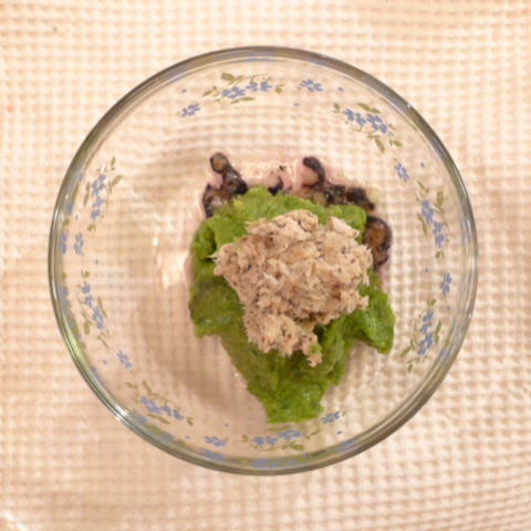 【夕ご飯】真鯛(山口天然)8g 黒豆納豆3g 芋15g 南瓜11g トマト16g 春きゃべつ5g ブロッコリ芽3g 小松菜3.5g ほうれん草3.5g スナップえんどう2.5g もやし5g 黒ごま0.5g ブルーベリー5g 俊粉1g ebi2T bio1.5g EsC0.4g Cilantro1g 湯40g