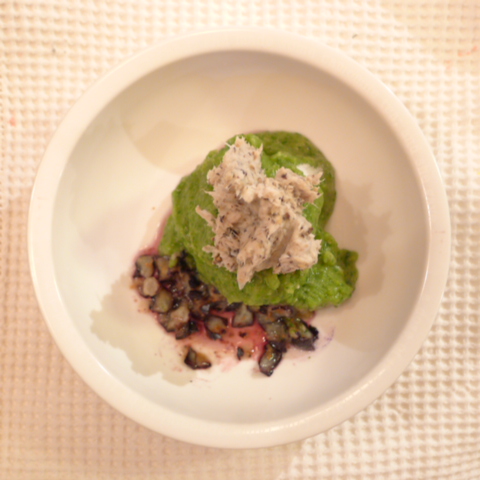 真鯛(山口天然)8g 黒豆納豆3g 芋15g 南瓜11g トマト16g 春きゃべつ5g ブロッコリ芽3g 小松菜3.5g ほうれん草3.5g スナップえんどう2.5g もやし5g 黒ごま0.5g ブルーベリー5g 俊粉1g ebi2T bio1.5g EsC0.4g Cilantro1g 湯80g