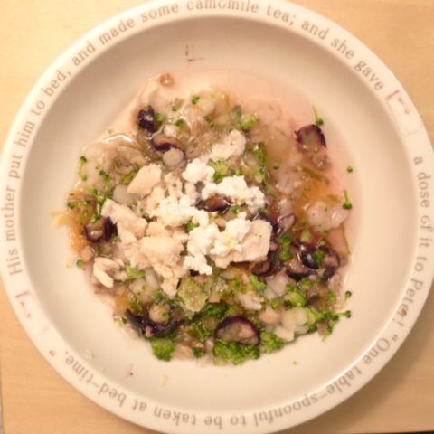 ささみ5.5g 納豆3g 押麦11g ブルーベリー5g きゃべつ5g ブロッコリ5g 人参5g マッシュ茸6g 昆布0.05g 亜麻仁油1g カッテージ3g 小岩井15g ebi1T bio2/3g VC0.2g
