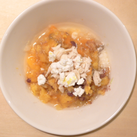 ささみ5g 納豆2.1g 小豆3.5g 安納芋20g きゃべつ5g もやし5g 人参8g カッテージ3g 亜麻仁油0.5g 湯30ccebi1T bio2/3g VC0.2g