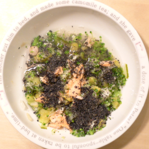 鮭7g 豆腐10g 安納芋15g きゃべつ5g ブロッコリ5g 小松菜5g もやし5g 昆布0.05g 黒ごま2.5g 小岩井20g カッテージ3g ebi1T bio2/3g VC0.2g Ca0.2g