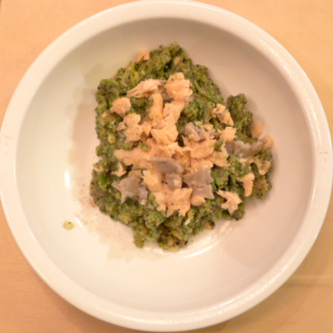 時鮭(北海道)10g 雪誉納豆3.2g 鳴門金時11g きゃべつ5g ブロッコリ5g 小松菜5g 南瓜11gトマト22g 黒ごま2.5g ブルーベリー5g ebi1T bio1g EsC0.3g cilantro1cc 湯75cc