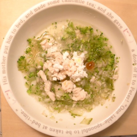 ささみ7g 卵5g 押麦11g りんご15g きゃべつ5g ブロッコリ6g もやし5g 昆布0.1g 亜麻仁油1g カッテージ2g 小岩井20g 湯80cc ebi1T VC0.2g Ca0.2g のこぎりやし1cap