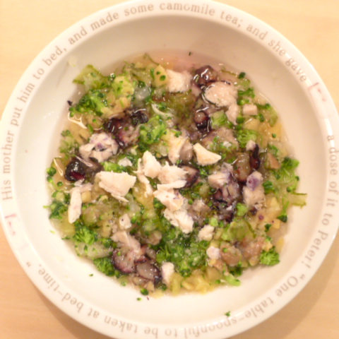 ささみ7g 納豆2.1g さつま芋15g きゃべつ5g ブロッコリ5g 小松菜5g もやし5g ブルーベリー4g 昆布0.05g 小岩井10g 湯90cc 亜麻仁油0.5g ebi1T bio2/3g VC0.2g Ca0.2g のこぎりやし1cap