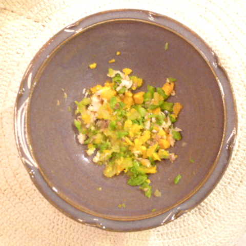 あじ(長崎)8g 芋15g 南瓜10g アスパラの穂10g 亜麻仁油2g 俊粉2g 湯100g