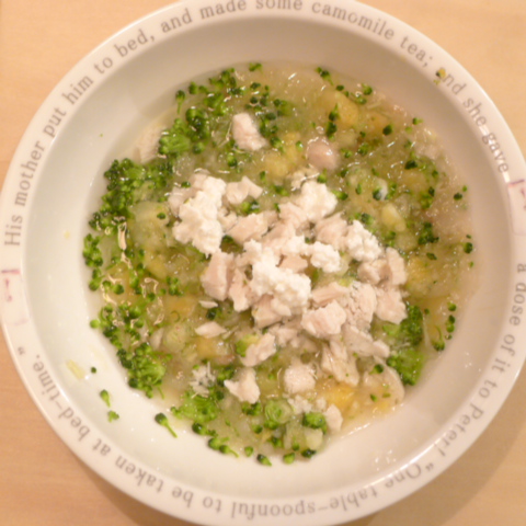 ささみ7g 納豆2.1g 安納芋15g りんご15g きゃべつ5g ブロッコリ5g もやし5g 昆布0.05g カッテージ3g 小岩井20g 湯70cc ebi1T bio2/3g VC0.2g